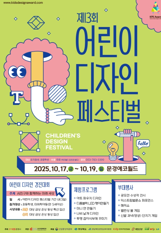 [뉴스다컴] 경상북도와 문경시가 주최하고 (사)디자인정책연구원이 주관하는 제13회 대한민국 어린이제품 디자인 공모전 ‘어린이 디자인 페스티벌’이 10월 17일부터 19일까지 사흘간 문경에코월드에서 열린다.