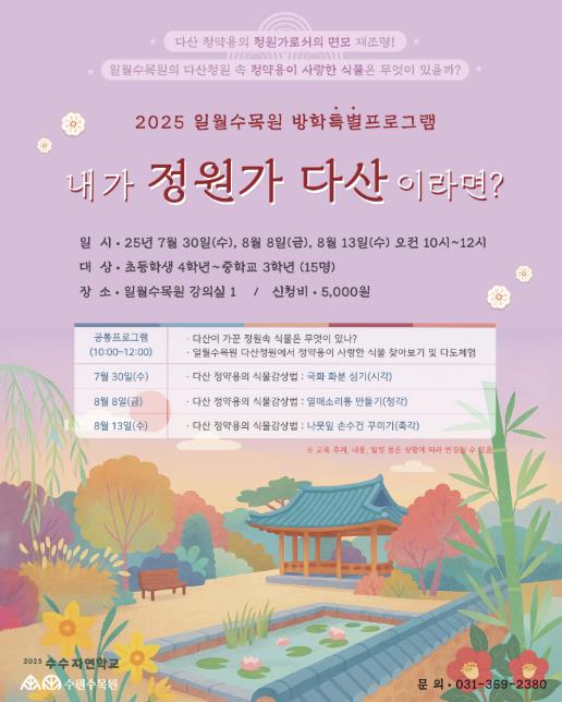 수원수목원 관계자는 “이번 여름방학 프로그램은 식물에 대한 흥미를 키우고, 역사 인물의 삶과 가치관을 자연스럽게 배우는 기회가 될 것”이라며 “어린이들이 자연과 문화를 함께 체험할 수 있는 교육 프로그램을 지속해서 운영하겠다”고 말했다.