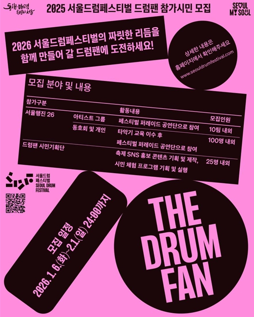 [뉴스다컴] 서울시는 오는 5월 동대문디자인플라자(DDP)에서 개최되는 ‘2026 서울드럼페스티벌’을 앞두고 축제의 주인공으로 활약할 ‘드럼팬(Drum Fan)’ 시민 참여자를 2월 1일까지 모집한다. 올해 축제는 단순 관람을 넘어 시민이 직접 기획하고 참여하는 ‘시민 주도형’ 축제가 될 것으로 기대된다.