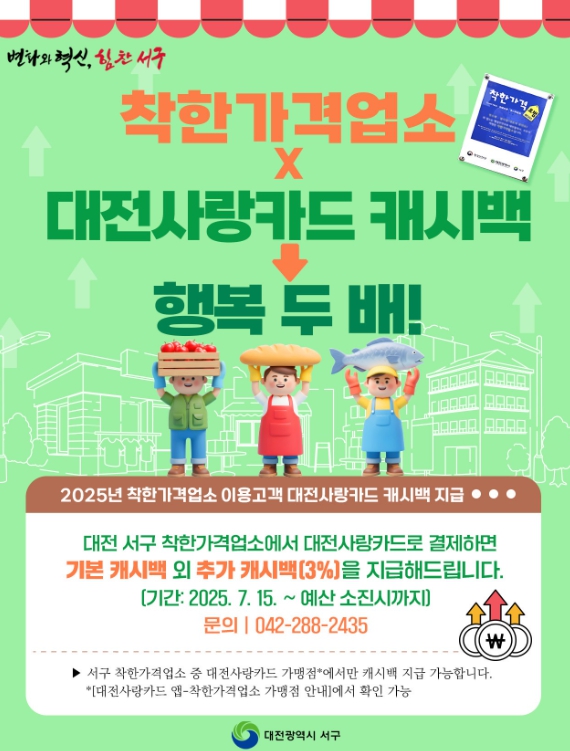 [뉴스다컴] 대전 서구는 이달 15일부터 관내 착한가격업소 가운데 대전사랑카드 가맹점에서 결제한 고객에게 기본 적립금 외에 3%의 추가 적립금을 지급한다고 밝혔다.