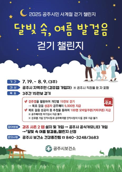 [뉴스다컴] 공주시는 시민들이 일상 속에서 꾸준히 걷는 습관을 기르고 건강한 생활을 실천할 수 있도록 ‘2025 공주시민 사계절 걷기 챌린지’의 두 번째 프로그램인 ‘달빛 속 여름 발걸음’ 걷기 챌린지를 운영한다고 밝혔다.