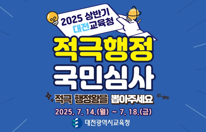 [뉴스다컴] 대전시교육청은 7월 14일부터 18일까지 2025년 상반기 적극행정 우수사례를 선발하기 위한 온라인 국민심사를 실시한다고 밝혔다.