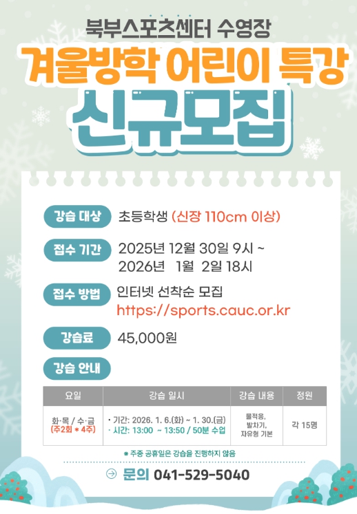 접수는 오는 30일 오전 9시부터 내년 1월 2일 오후 6시까지 북부스포츠센터 누리집에서 선착순으로 진행되며, 강습료는 4만 5,000원이다.
