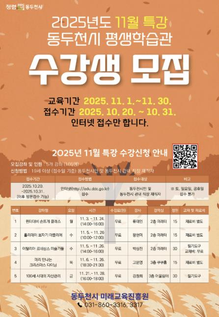 이번 특강은 계절감과 시민 수요를 반영한 다양한 주제로 구성됐으며, 남녀노소 누구나 참여할 수 있는 생활 밀착형 프로그램으로 운영된다. 수강 신청은 10월 31일까지 동두천시 미래교육진흥원 홈페이지에서 온라인으로 접수할 수 있다.