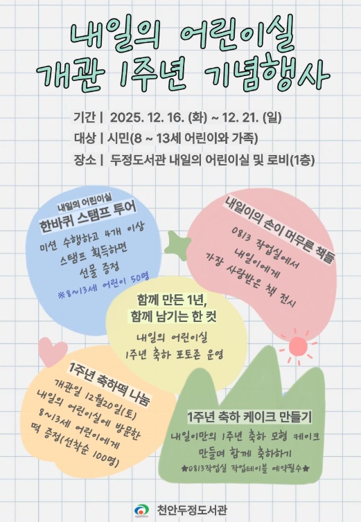 [뉴스다컴] 천안시 두정도서관은 오는 16~ 21일 ‘내일의 어린이실’ 개관 1주년 맞아 다채로운 기념행사를 운영한다고 15일 밝혔다.