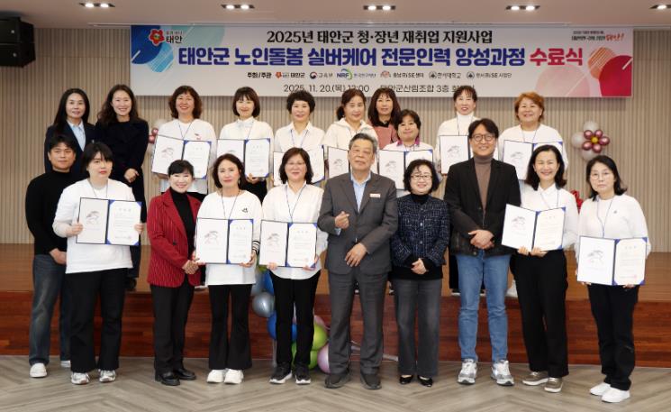 [뉴스다컴] 태안군이 지난 20일 태안군산림조합 회의실에서 가세로 군수 등 군 관계자와 한서대RISE사업단 관계자, 교육생 등 20여 명이 참석한 가운데 ‘노인돌봄 실버케어 전문인력 양성과정 수료식’을 열고 총 12명의 교육생에게 수료증을 수여했다고 밝혔다.
