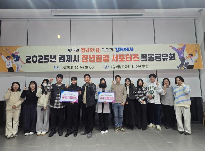 [뉴스다컴] 김제시는 지난 20일, 김제 청년공간 E :DA(이다)에서'2025년 청년 서포터즈 활동공유회'를 개최하고, 올해 서포터즈가 추진한 정책 제안과 다양한 활동을 공유했다고 밝혔다.