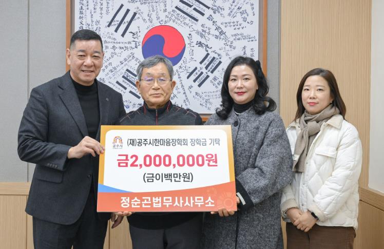 [뉴스다컴] 정순곤법무사사무소는 지난 6일 (재)공주시한마음장학회에 가정형편이 어려운 학생들을 위한 장학금 200만 원을 기탁했다.