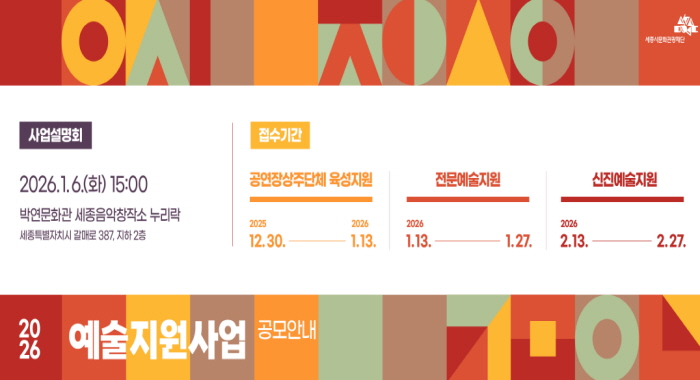 [뉴스다컴] 세종시문화관광재단은 세종시 예술인들의 창작활동 활성화와 시민의 문화예술 향유 기회를 확대하기 위한 2026년 예술지원사업 공모를 진행한다.