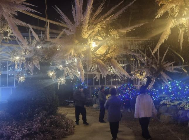 다육식물관 입구에서는 은은한 빛을 머금은 공(球) 조형물이 먼저 시선을 사로잡으며 겨울 축제의 분위기를 한껏 끌어올린다. 주변 화단에는 빛줄기 장식과 작은 광원들이 촘촘히 배치돼 방문객을 포근한 빛의 길로 안내한다.