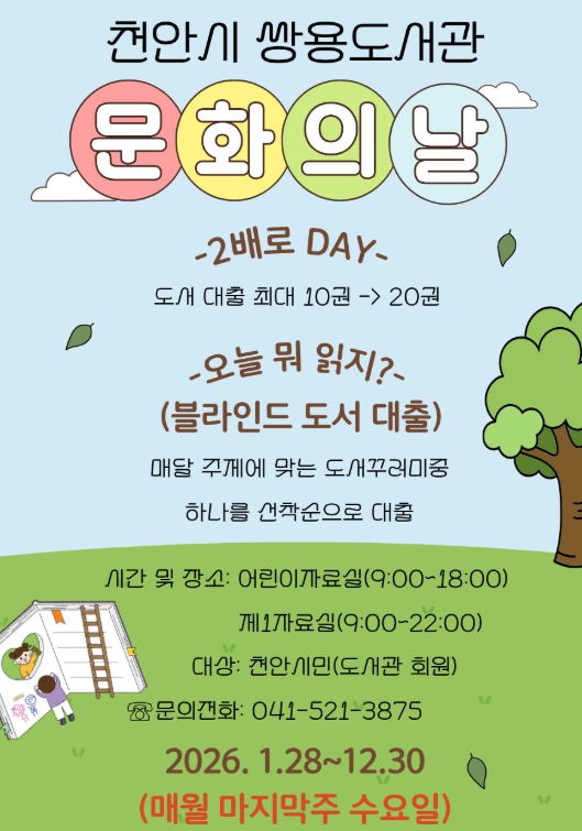 [뉴스다컴] 천안시 쌍용도서관은 매달 마지막주 수요일 ‘2026 문화가 있는 날’ 행사를 운영한다고 16일 밝혔다.