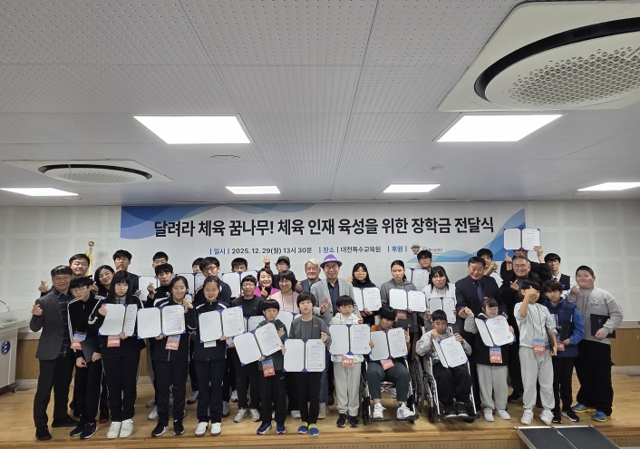 [뉴스다컴] 대전특수교육원은 12월 29일 본원과 한밭수목원 엑스포시민광장에서 장애학생 육상 종목 특기생과 미래 육상 꿈나무 63명을 대상으로 (재)조웅래나눔재단(이사장 조웅래)으로부터‘체육(육상) 종목 미래인재 장학금 전달식 및 달리기 행사’를 개최하고, 장학증서를 수여했다