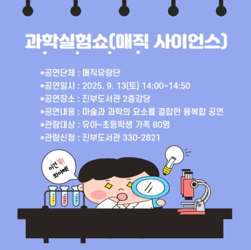 이번 공연은 5세 이상 어린이와 가족 80여 명을 대상으로 부모와 아이가 함께 참여할 수 있도록 기획됐으며, 체험형 과학 실험을 주제로 재미와 학습을 동시에 느낄 수 있는 시간이 될 예정이다.