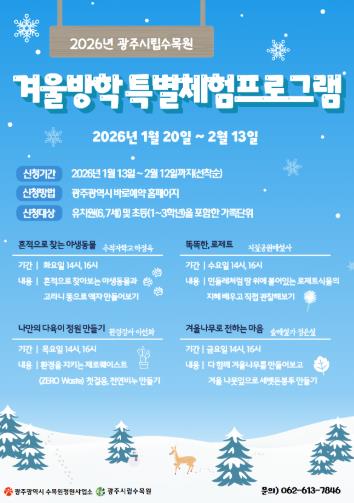 [뉴스다컴] 광주광역시 시립수목원은 어린이를 위한 ‘2026년 겨울방학 체험 프로그램’ 참가자 640명을 오는 13일 오전 10시부터 선착순 모집한다.