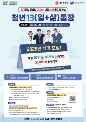 [뉴스다컴] 광주광역시는 일(1)하는 청년의 더 나은 삶(3)을 지원하는 ‘청년13(일+삶)통장’ 제11기 참여자를 8일부터 18일까지 모집한다.