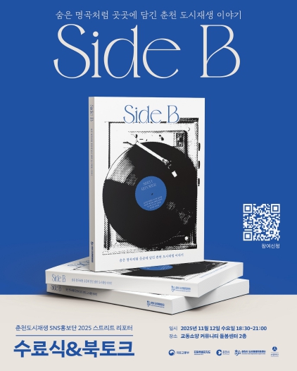 춘천시 관계자는 “‘Side B’는 행정이 아닌 시민의 눈으로 바라본 도시재생의 이야기”라며 “이번 행사가 시민이 함께 도시재생의 의미를 나누고 참여하는 계기가 되길 기대한다”고 말했다.