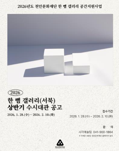 [뉴스다컴] (재)천안문화재단은 오는 28일부터 상반기 한 뼘 갤러리 수시대관 공모 접수를 받는다고 27일 밝혔다.