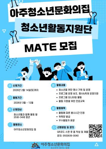 [뉴스다컴] 거제시 아주청소년문화의집은 오는 2월 14일까지 2026년 청소년 활동을 이끌어갈 청소년활동지원단“MATE”단원을 모집한다고 밝혔다.