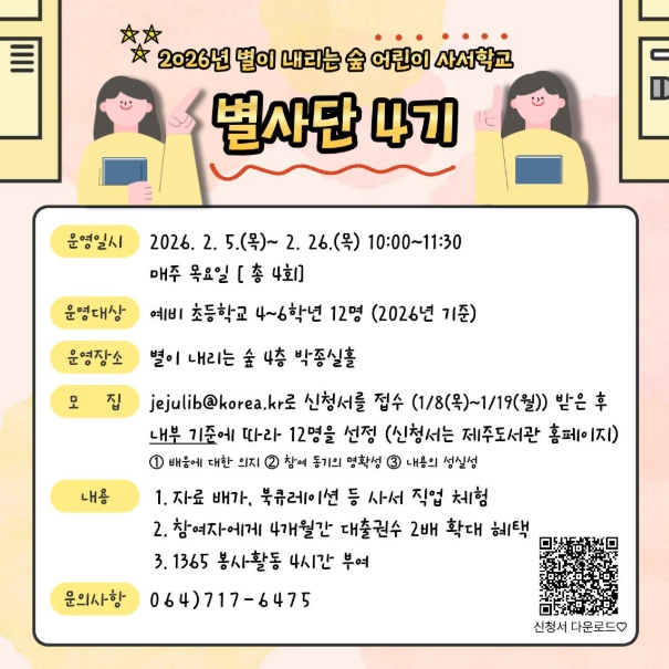 [뉴스다컴] 제주도교육청 제주도서관은 어린이들이 사서 직업을 직접 체험하며 도서관의 역할과 가치를 이해할 수 있도록 2026년 별이 내리는 숲 어린이 사서 학교 ‘별사단 4기’를 운영한다.