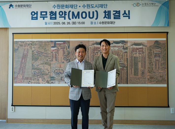 오영균 수원문화재단 대표이사는 “수원문화재단이 보유한 문화예술 콘텐츠와 전문 인프라가 수원도시재단의 주요 사업과 결합하면 문화와 도시가 어우러진 새로운 협력 모델을 만들 수 있다”며, “이번 협약으로 향후 시민의 문화 향유 기회를 한층 확대할 수 있을 것으로 기대한다”고 말했다.