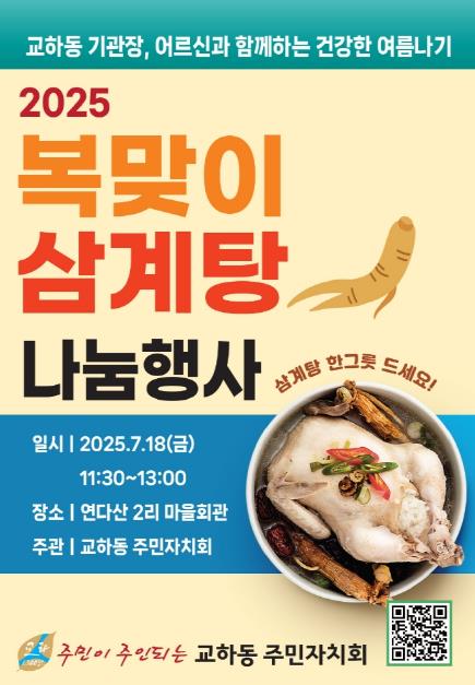 박용호 교하동 주민자치회장은 “무더운 여름, 위원들이 정성껏 준비한 삼계탕을 드시고 어르신들께서 건강하게 여름을 나시길 바라는 마음으로 준비했다”라며 “앞으로도 모든 세대가 함께 누리는 더욱 살기 좋은 교하동을 만들기 위해 노력하겠다”라고 말했다.