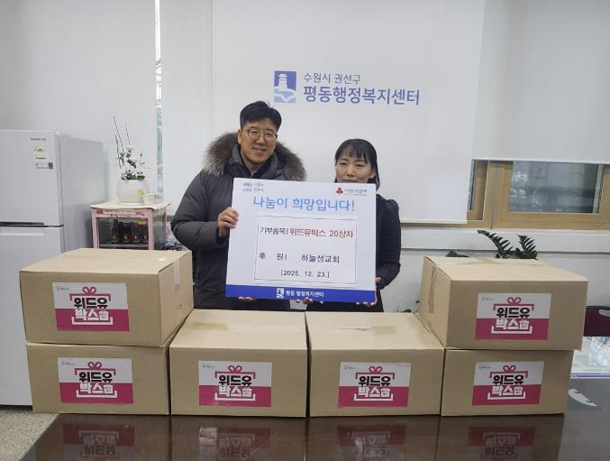 [뉴스다컴] 수원시 권선구 고색동 소재 하늘성교회는 지난 23일 성탄절을 맞이하여 '위드유박스' 21박스를 평동 행정복지센터에 전달했다.
