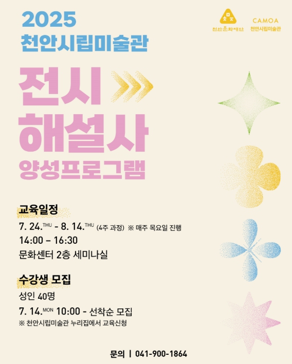 [뉴스다컴] 천안문화재단은 오는 7월 14일부터 천안시립미술관 전시해설사 양성프로그램 참여자를 모집한다고 11일 밝혔다.