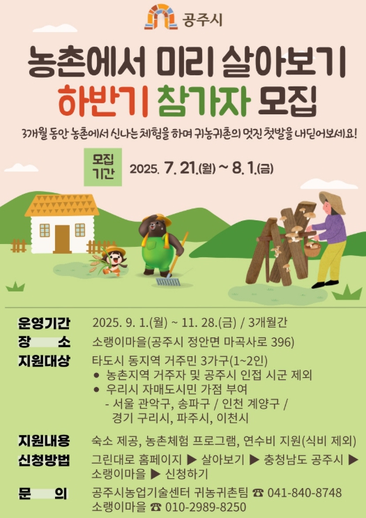 [뉴스다컴] 공주시는 예비 귀농‧귀촌인이 농촌 생활을 직접 체험하며 미래를 준비할 수 있도록 돕는 ‘농촌에서 미리 살아보기’ 프로그램의 하반기 참가자를 오는 8월 1일까지 모집한다고 밝혔다.
