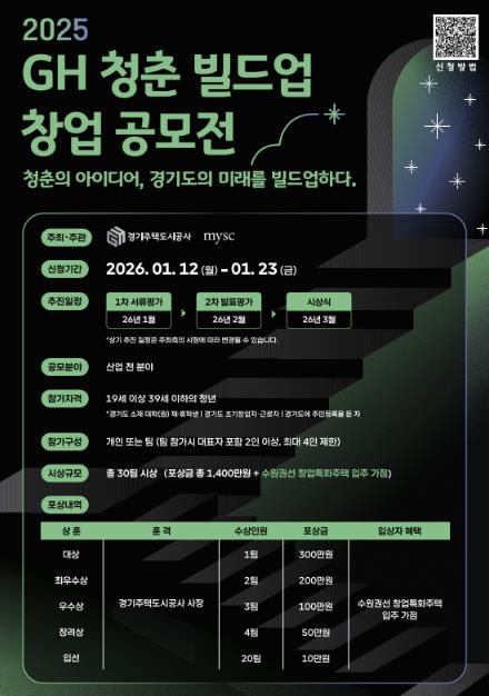 [뉴스다컴] 경기주택도시공사(GH)는 ‘청춘의 아이디어, 경기도의 미래를 빌드업하다!’라는 슬로건 아래, 청년들의 참신한 창업 아이디어 발굴을 위한 '2025 GH 청춘 빌드업 창업 공모전'을 24일 공고했다고 밝혔다.