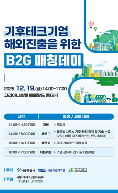 [뉴스다컴] 19일 서울시는 서울시립대학교, 국가녹색기술연구소와 공동으로'기후테크기업 해외진출 지원을 위한 B2G 매칭데이'를 개최했다. 서울시는 이번 행사가 시의 국제 협력 기반을 활용해 기후테크 분야의 기술·정책 교류를 확대하고, 실질적인 민관 협력 모델을 발굴하기 위해 마련했다고 밝혔다.