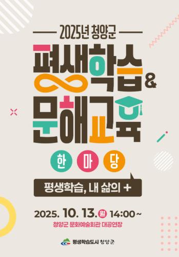 [뉴스다컴] 청양군은 오는 13일 오후 2시 청양군 문화예술회관 대공연장에서 군민 모두가 함께 배우고 즐기는 축제, ‘2025 평생학습 & 문해교육 한마당’을 개최한다.