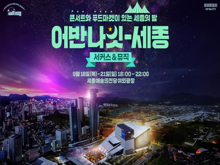 [뉴스다컴] 세종시문화관광재단은 오는 9월 ‘밤마실 주간’에 맞춰 18일부터 21일까지 나흘간 세종예술의전당 야외광장에서 매일 저녁 6시부터 10시, 야간 문화행사 ‘어반나잇-세종 서커스·뮤직’ 을 선보인다.