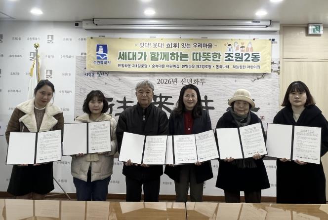 [뉴스다컴] 수원시 장안구 조원2동은 지난 3일, 행정복지센터 2층 소회의실에서 세대 간 교류 활성화 및 공동체 의식 함양을 위한 경로당–어린이집 결연식을 개최했다.