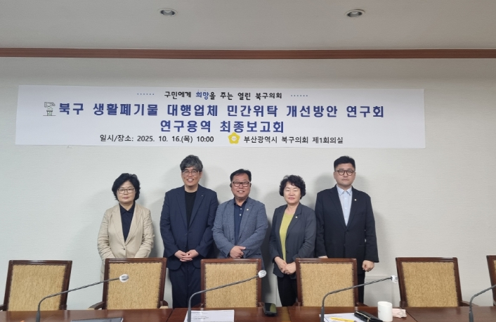 [뉴스다컴] 부산광역시 북구의회 의원연구단체 ‘북구 생활폐기물 대행업체 민간위탁 개선방안 연구회’(대표의원 임성배)가 10월 16일 오전 10시,‘북구 생활폐기물 민간위탁 개선방안 연구용역’최종보고회를 개최했다.