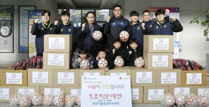 [뉴스다컴] 수원시 장안구는 장안리틀풋볼아카데미가 지난 30일 장안구청에 라면 25상자와 축구공 20개 기부했다고 밝혔다. 이번 기부는 아카데미 회원들이 십시일반으로 정성을 모아 마련한 것으로, 장안구 관내 어려운 이웃들에게 전달될 예정이다.