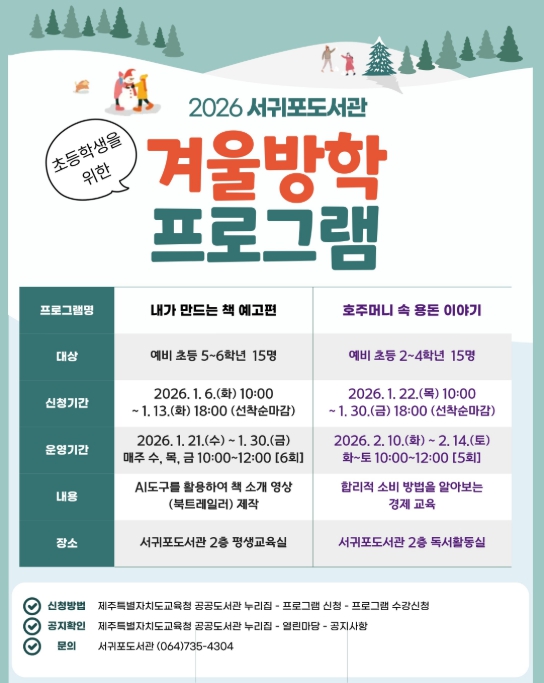 [뉴스다컴] 제주도교육청 서귀포도서관은 겨울방학을 맞아 어린이들의 호기심을 자극해 책 읽기의 즐거움과 경제 감각을 키우는 겨울방학 프로그램을 운영하며, 내년 1월 6일부터 참가자를 모집한다.