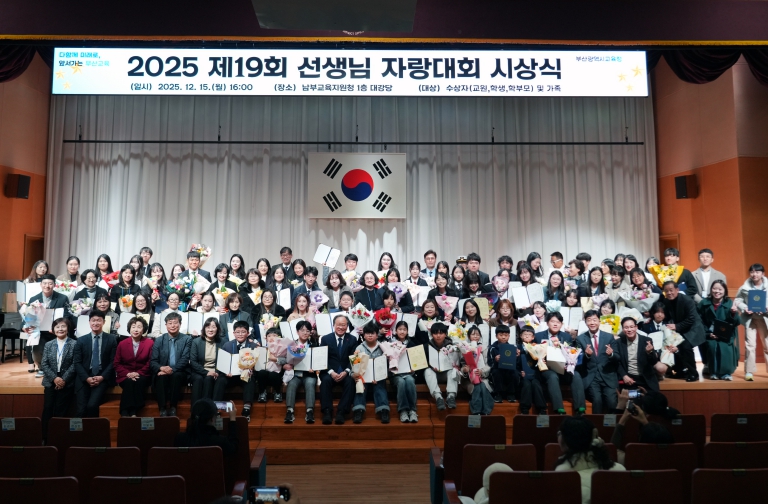부산광역시교육청과 부산지역사회교육협의회(회장 박종필)는 지난 15일 오후 남부교육지원청 대강당에서 ‘제19회 2025 선생님 자랑대회 시상식’을 개최했다.