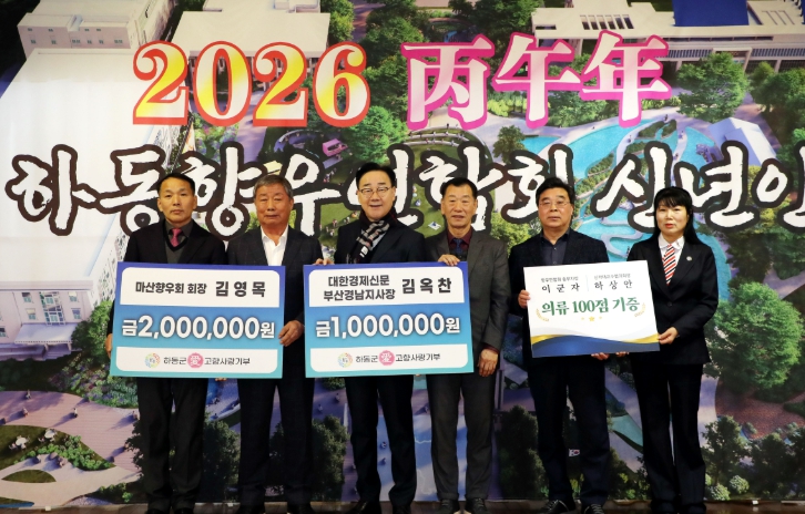 [뉴스다컴] 하동군은 지난 9일 개최된 ‘전국하동향우연합회 2026년 신년인사회’에서 김영목 마산향우회장과 김옥찬 대한경제신문 부산·경남 지사장이 각각 고향사랑기부금 200만 원, 100만 원을 전달했다고 밝혔다.
