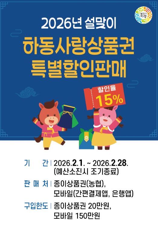 [뉴스다컴] 하동군은 설 명절을 맞아 지역 내 소비를 촉진하고 소상공인의 매출 증대를 도모하기 위해 '2026년 설맞이 하동사랑상품권 특별할인판매'를 실시한다고 밝혔다.