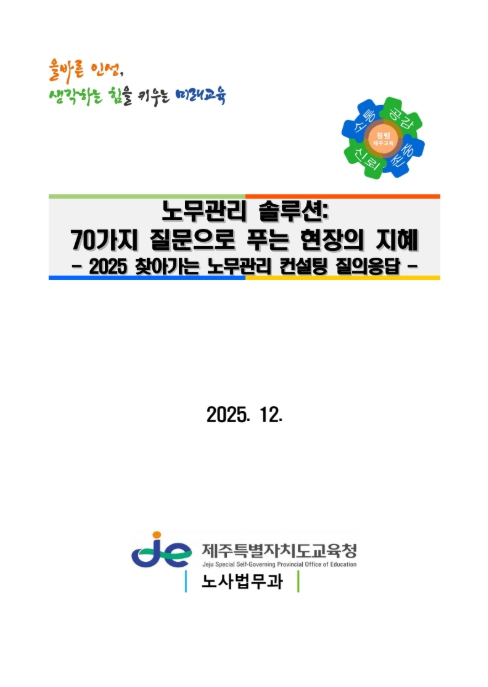 [뉴스다컴] 제주특별자치도교육청은 5일 ‘노무관리 해결책(솔루션): 70가지 질문으로 푸는 현장의 지혜–2025 찾아가는 노무관리 컨설팅 질의응답’ 자료집을 제작·배포한다.