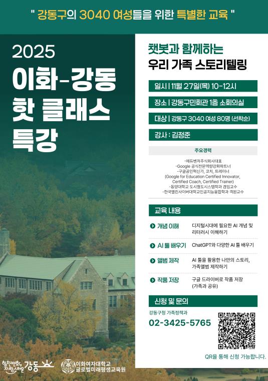 이수희 강동구청장은 “3040 세대 여성들이 디지털 시대에 꼭 필요한 AI 역량을 쉽게 키울 수 있도록 실습 중심의 교육을 마련했다”라며, “‘이화강동 핫 클래스’에 대한 높은 호응에 힘입어, 내년부터 확대 운영을 검토하고 있으며, 앞으로도 구민의 일상에 실질적인 도움이 되는 프로그램을 지속 발굴 운영해가겠다”라고 말했다.