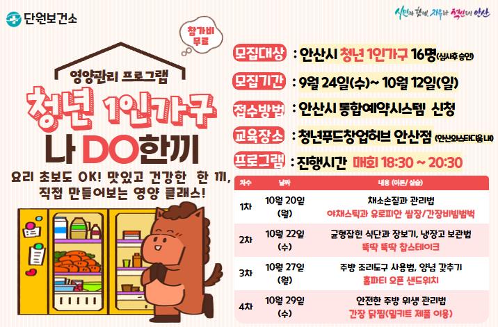 [뉴스다컴] 안산시 단원보건소는 오는 24일부터 청년 1인가구 영양관리 프로그램 ‘나DO한끼’ 참여자를 모집한다고 23일 밝혔다.
