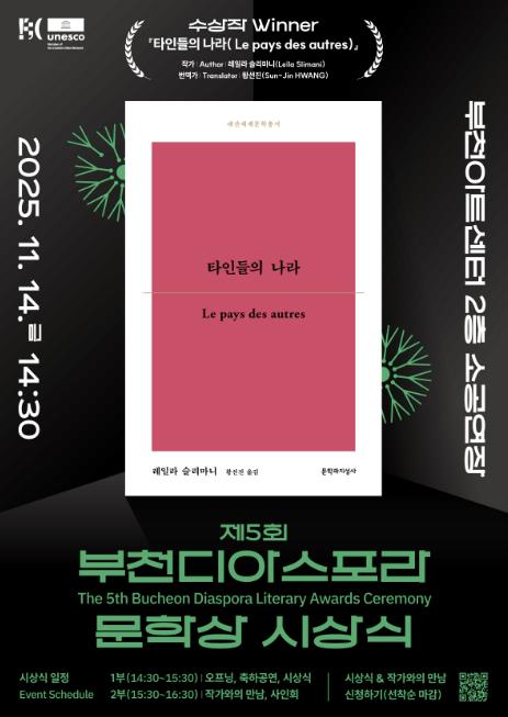 [뉴스다컴] 부천시는 11월 14일 부천아트센터에서 열리는 ‘2025년 제5회 부천디아스포라문학상’ 시상식을 앞두고, 수상작으로 레일라 슬리마니 작가의 ‘타인들의 나라(Le pays des autres)’를 선정했다고 22일 밝혔다.