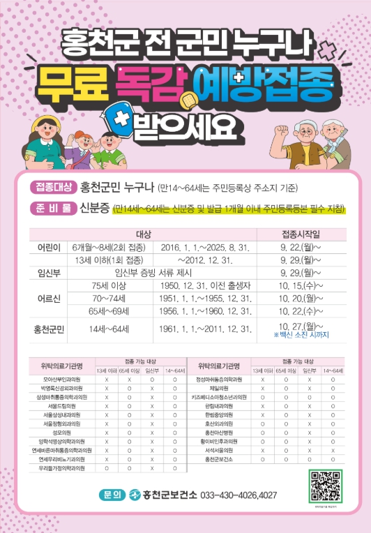 [뉴스다컴] 홍천군보건소가 오는 9월 22일부터 2025-2026절기 인플루엔자 예방접종을 시작한다고 밝혔다.