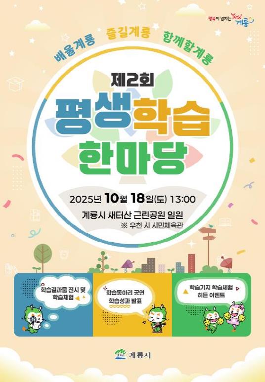 [뉴스다컴] 계룡시는 오는 18일 오후 1시부터 시청 앞 새터산 근린공원에서 시민이 주도하는 배움의 축제 “2025 제2회 계룡시 평생학습 한마당”을 개최한다고 밝혔다.