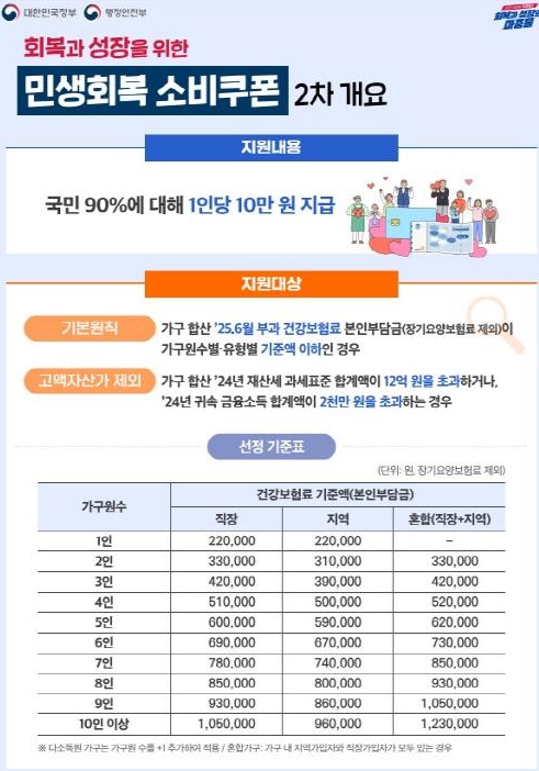 소득기준은 2025년 6월 부과된 건강보험료 납부액을 적용하며, 고액 자산가나 금융소득이 많은 가구는 별도 컷오프 기준을 적용해 제외된다.