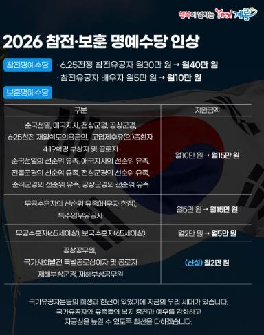 주요 인상 내용으로는 참전명예수당의 경우 ▲6·25참전유공자에게 월 10만 원을 추가 지급하고 ▲참전유공자 배우자 복지수당을 월 5만 원에서 월 10만 원으로 인상했다.
