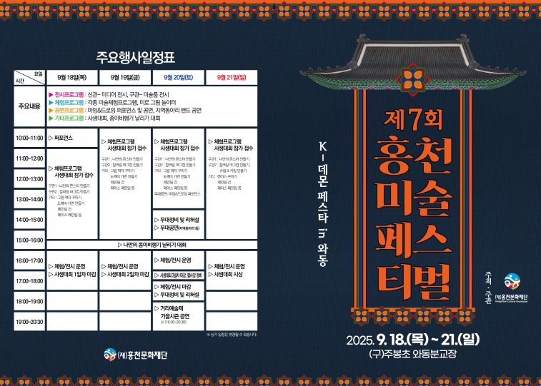 [뉴스다컴] 홍천군과 홍천문화재단은 오는 9월 18일부터 21일까지 홍천미술관 와동분관에서(구 와동분교) 케이 데몬을 재해석한 문화예술 행사 및 제7회 홍천미술페스티벌을 개최한다.