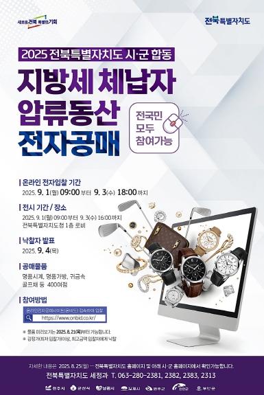 [뉴스다컴] 전북특별자치도는 전국 최초로 한국자산관리공사(온비드) 이용기관 페이지를 활용한 시‧군 합동 압류물품 온라인 전자공매를 실시한 결과, 총 288건이 전량 낙찰되어 2억7천7백만 원의 체납액을 징수했다고 27일 밝혔다.