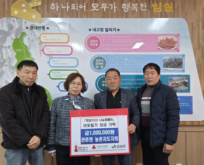 소지현 관촌면장은 “어려운 시기에 이웃을 위하는 마음으로 성금을 기탁해주셔서 진심으로 감사드리며, 관촌면 농촌지도자회에서 보내주신 관심은 지역 주민들의 추운 겨울을 조금 더 따뜻하게 보내는데 큰 힘이 될 것 같다.”고 전했다.